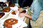 | 一人で一台づつ自分のお菓子を計量から仕上げまで実習、作ったお菓子は全てお持ち帰りになれます。 | 実習後は楽しいティータイム | 毎年クリスマスにはユニークなクリスマスケーキを施設に寄付しております。 |